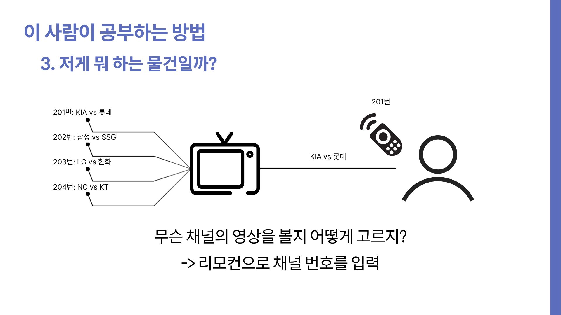 이때, 난 보통 일상생활 속 비슷한 예시를 찾아본다. 여기선 TV랑 리모컨이 거기에 해당됐다.