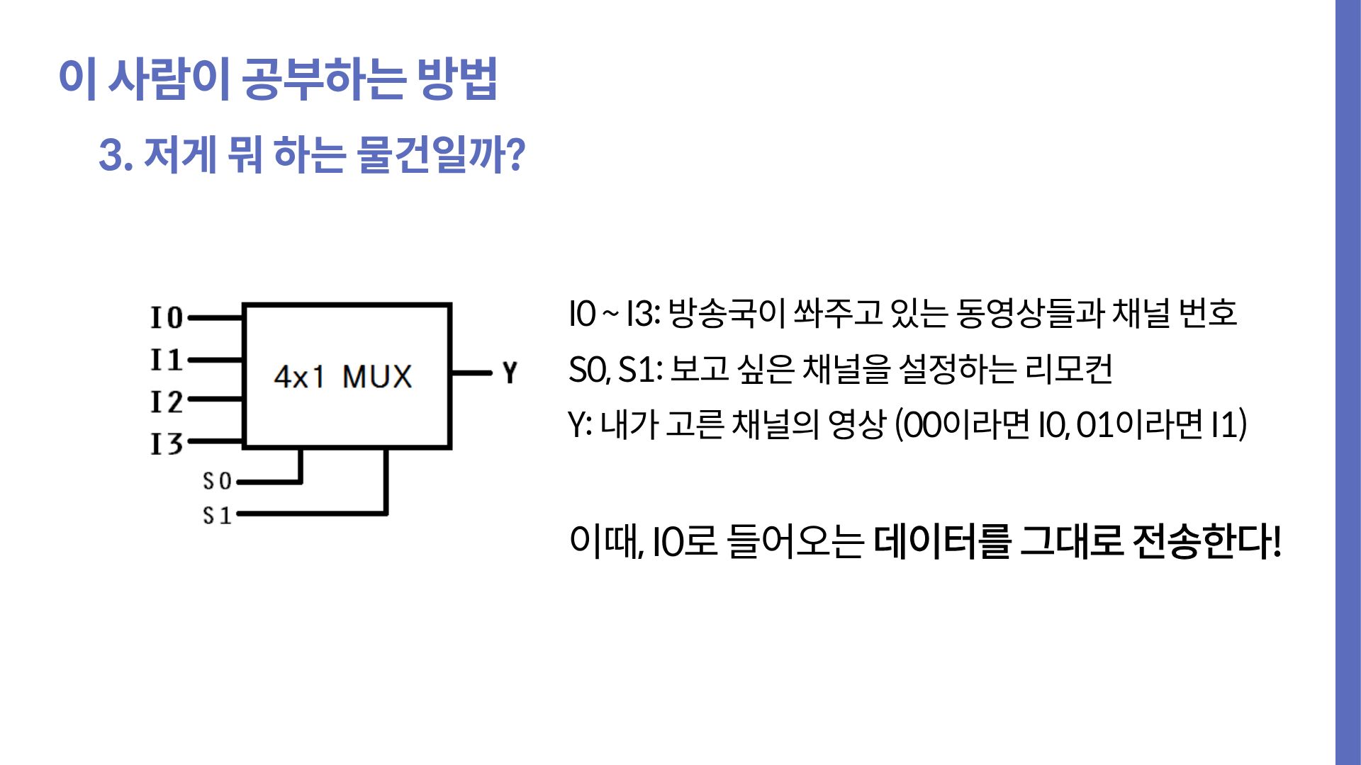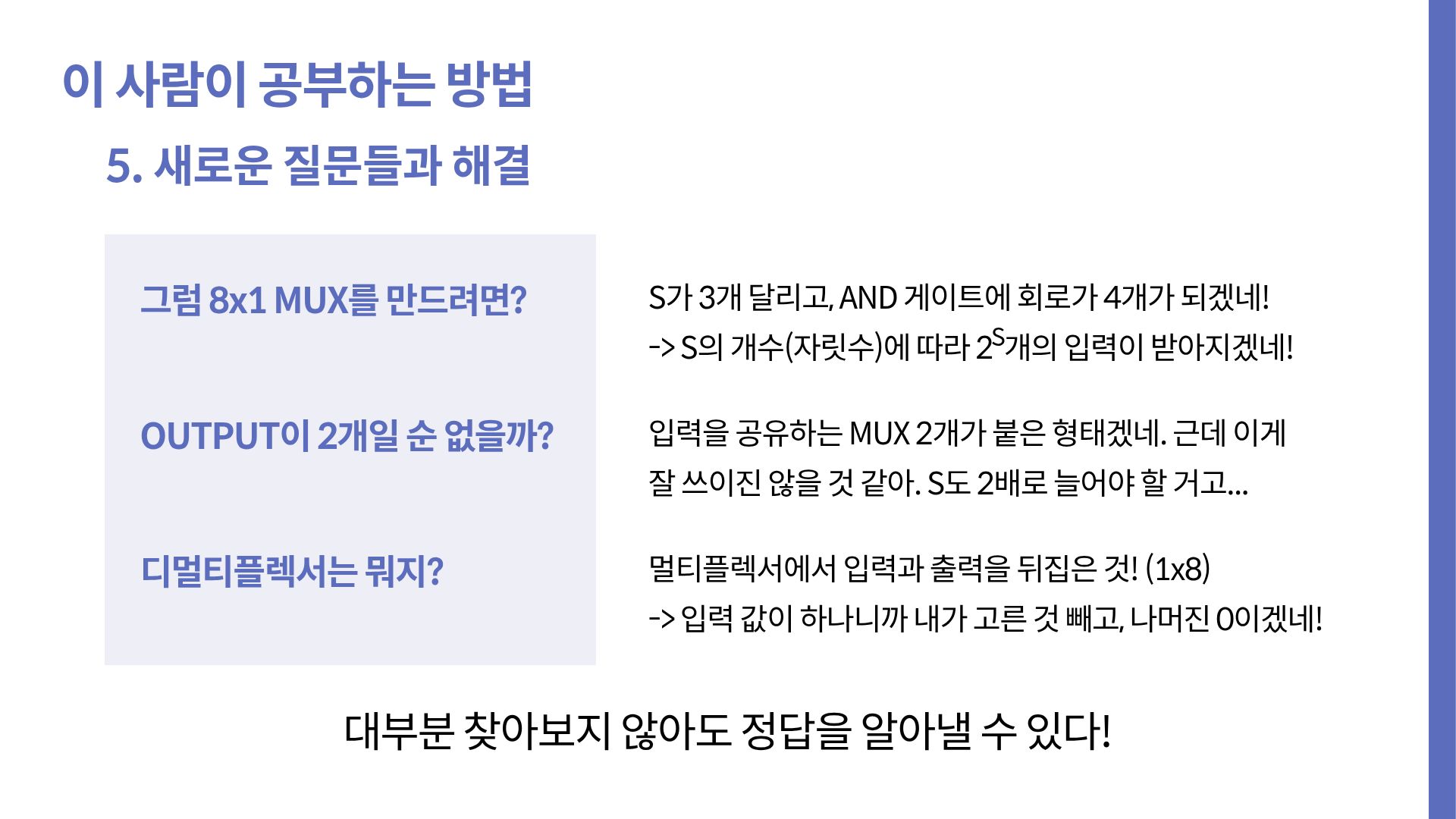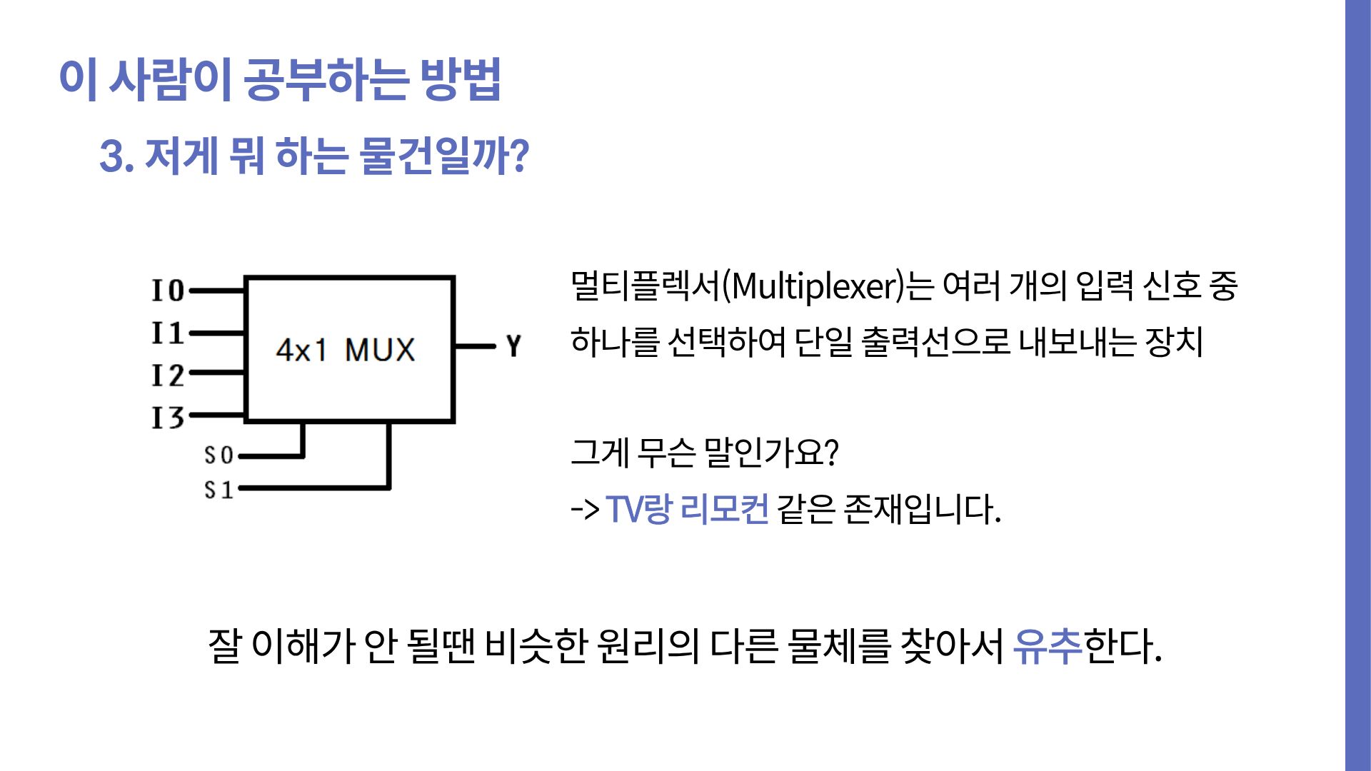만약 우리가 멀티플렉서에 대한 글만 보고 외우기만 했다면, 모든 입력 경로엔 항상 값이 전달된다. 같은 명제엔 참인지 거짓인지 답할 수 없다. 하지만 우리가 알던 것들에 빗대보고, 비교하면서 책에 없는 내용에도 답할 수 있게 됐다. 나는 최소한 이 과정까진 거쳐야 이해라고 표현한다.