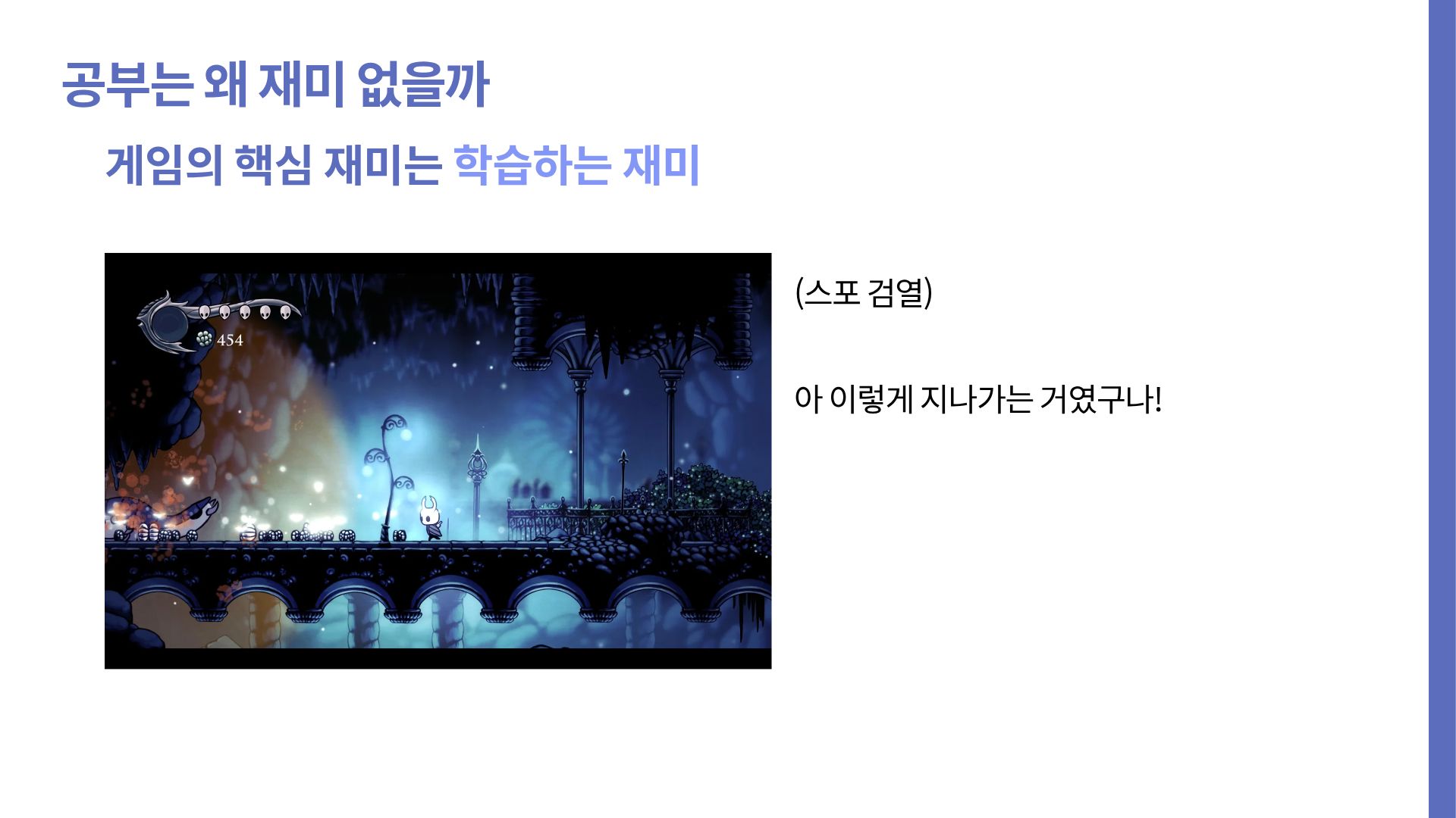 우리가 좋아하는 그 어떤 게임, 나아가 스포츠를 가져와도, 배우지 않고 할 수 있는 것은 없다. 야구 룰을 모른 채 야구를 할 수 없고, 조작키를 모른 채 할로우 나이트 엔딩을 볼 수 없다.