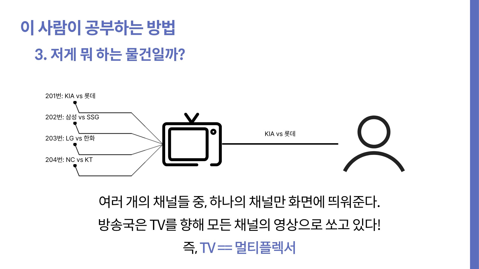TV는 우리가 입력한 채널의 영상을 틀어준다. 이처럼, 여러 개의 입력 신호(채널별 영상들) 중, 하나를 선택(리모컨으로 채널 입력)하여, 단일 출력선(TV의 화면. 하나니까 단일)으로 내보내는 장치가 곧 멀티플렉서다.