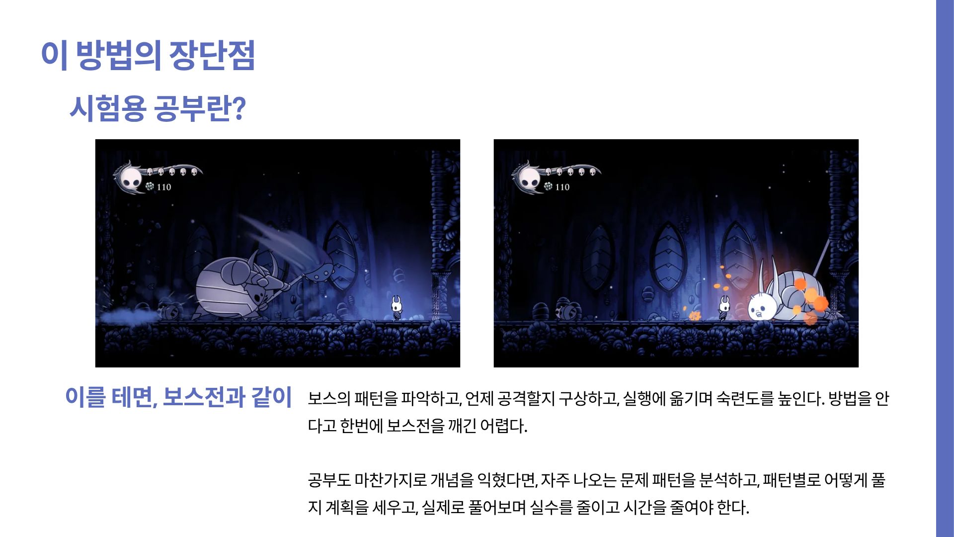 이러한 문제들의 공통점은 시간이나 정확도를 요구한다는 것이다. 아무리 공략 영상을 많이 봤다한들, 다크 소울을 처음 하면서 한 대도 맞지 않고 클리어하긴 어렵다. 머리로 아는 것과, 몸으로 체득하는 건 다르니까. 그러니 당신이 깨려는 보스(시험)가 이 영역에 있다면, 익숙해질 때까지 계속해서 도전하고, 깨져보자.